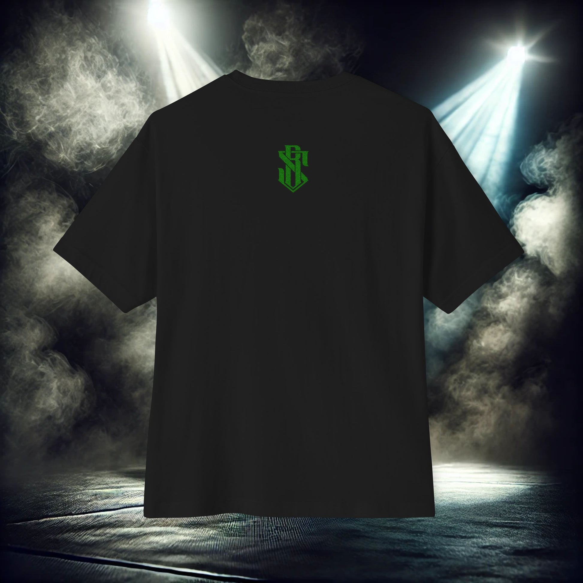 Distressed green stencil print on a heavyweight black boxy tee—cut to move, built to last.